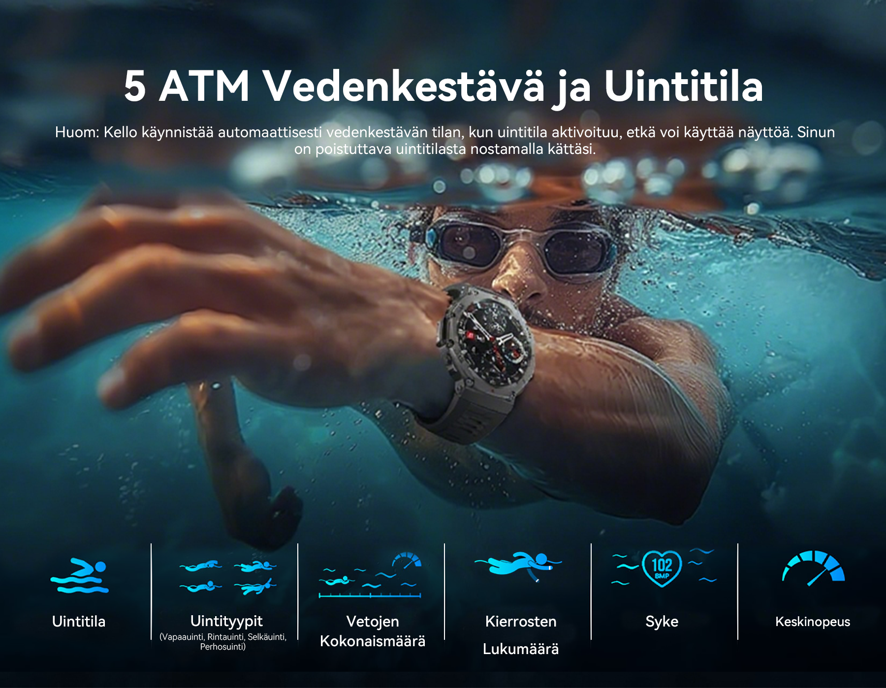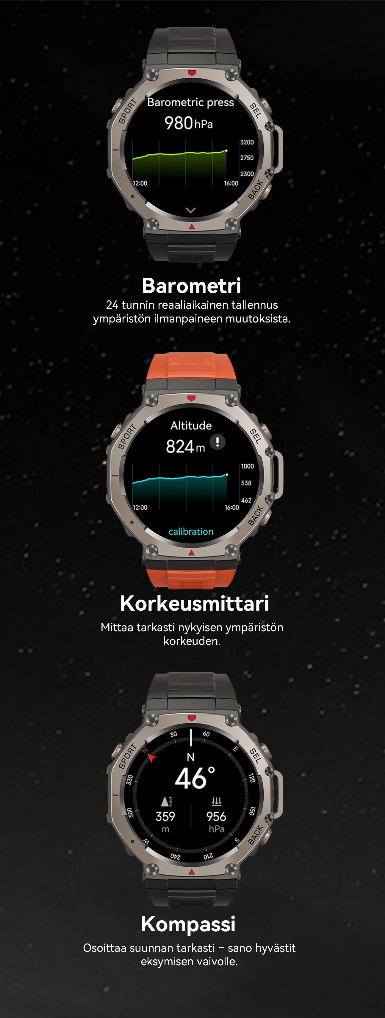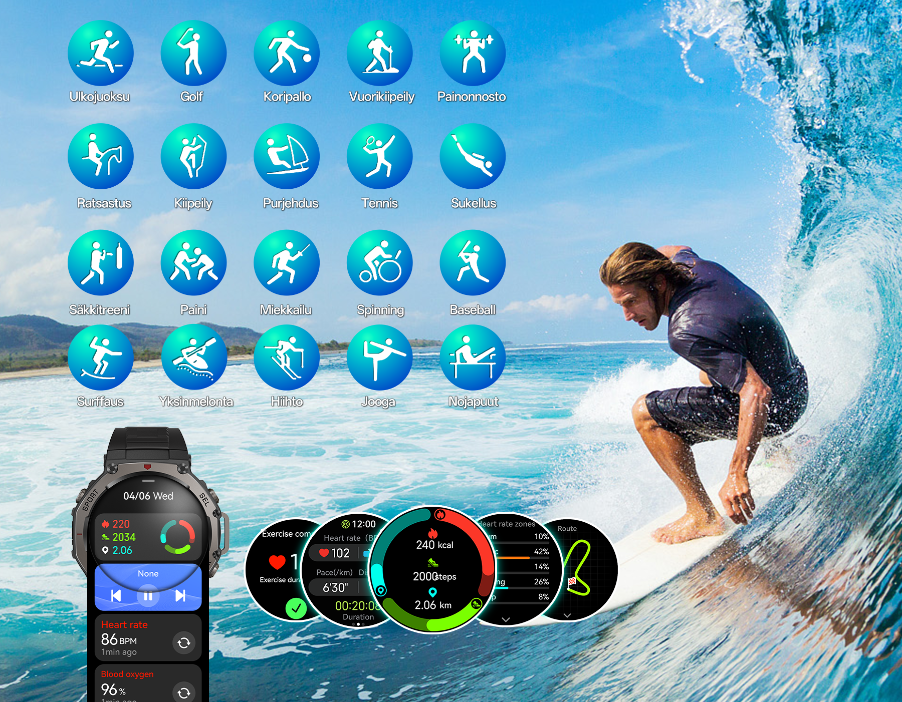 - Kattava urheilun ja terveyden seuranta – Monitoimianturit seuraavat tarkasti yli 170 urheilulajia ja terveystietoa.