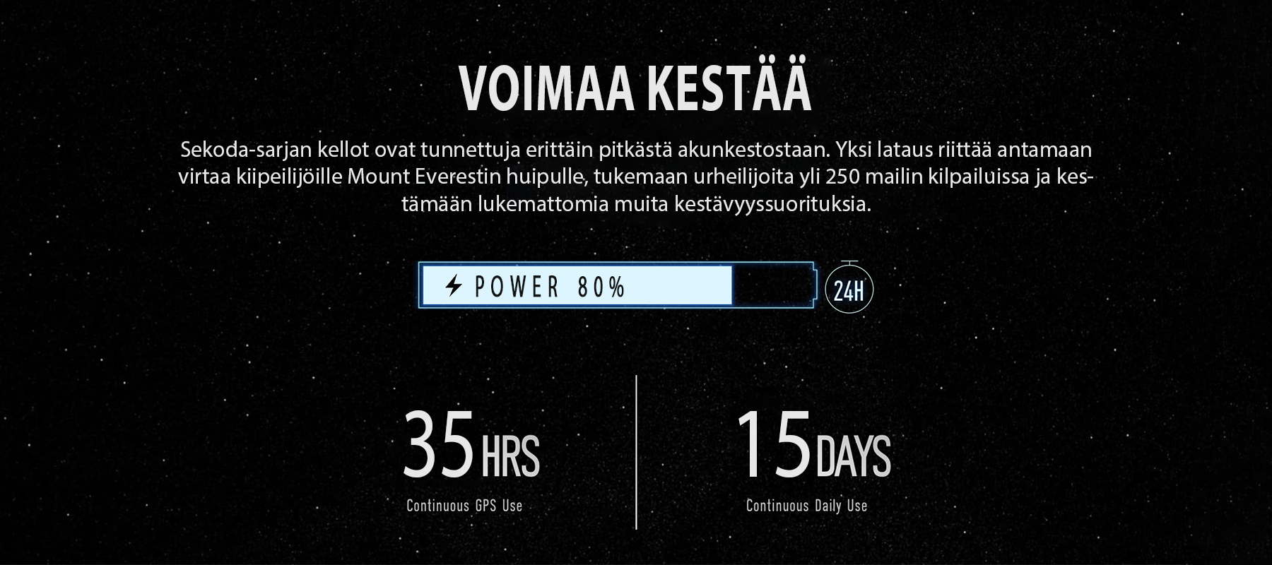 - Erittäin pitkä akun kesto – Tehokas akku tarjoaa 15 päivää käyttöaikaa peruskäytössä tai 35 tuntia jatkuvassa GPS-tilassa.