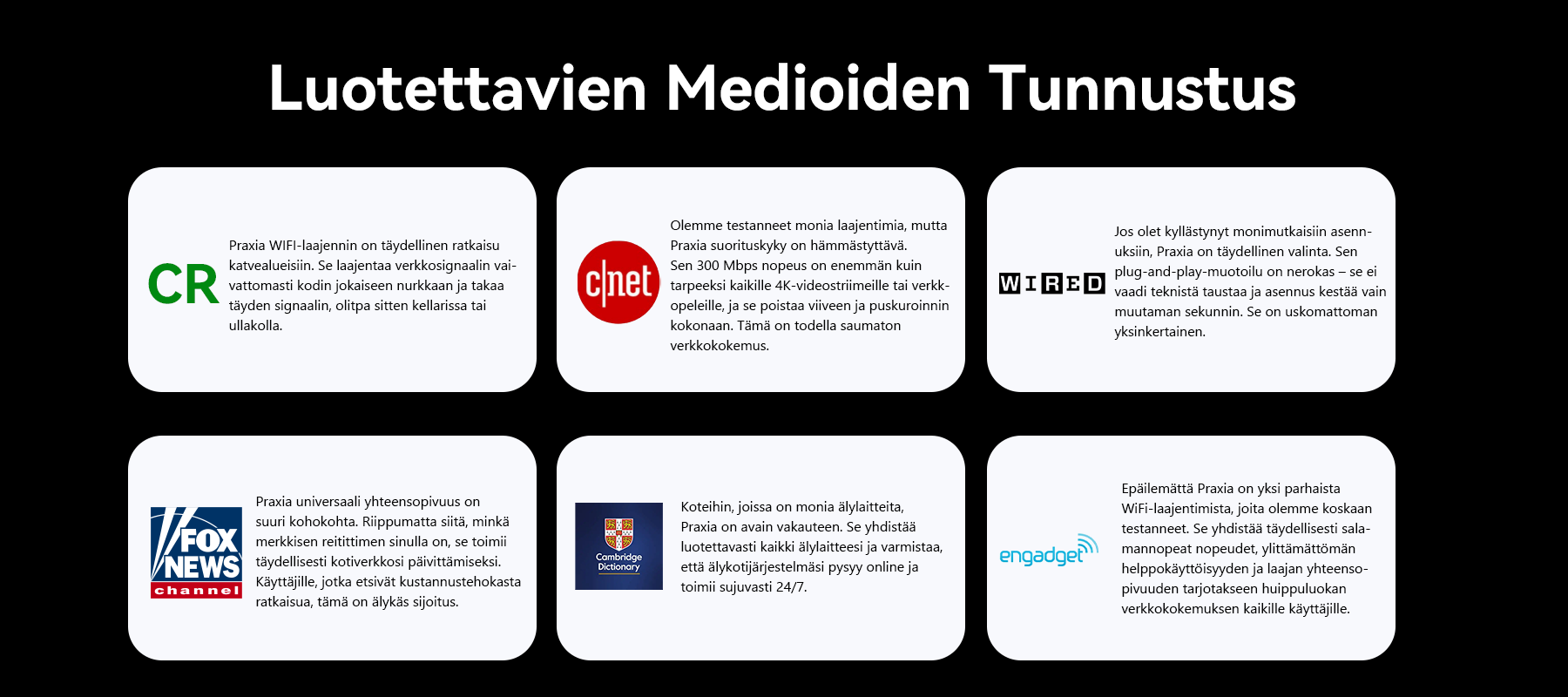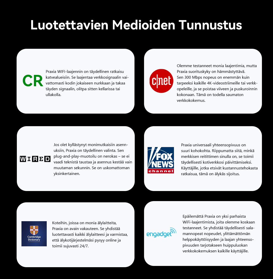 Tuloksena syntyi Praxia WiFi-vahvistin. Laitteen ainoa tehtävä on laajentaa kotisi langatonta verkkoa ja poistaa katvealueet. Sen tehokas kaksoisantenniteknologia ja plug-and-play-muotoilu takaavat vakaan ja nopean verkon jokaiseen huoneeseen ja jokaiselle laitteelle. Tämä on Praxian ydinlupaus: tuoda verkko kodin jokaiseen kolkkaan.